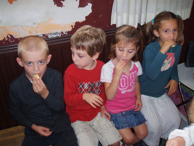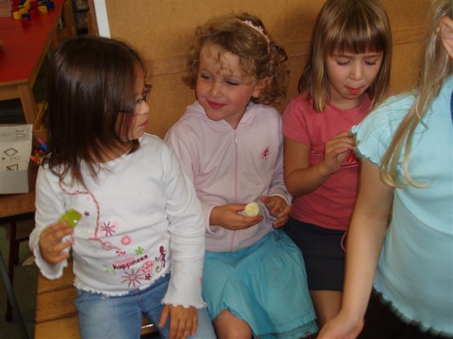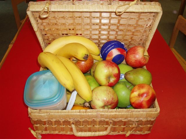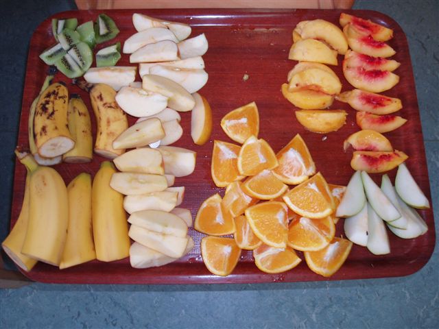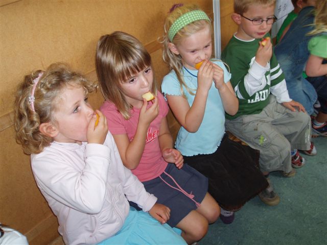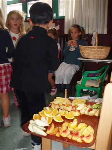 kleuters komen om beurt een stukje fruit kiezen Ze leren delen, samen eten,...... En.... de kiwi's waren eerst weg, dan de bananen en wat bleef er liggen tot het laatst? de appeltjes