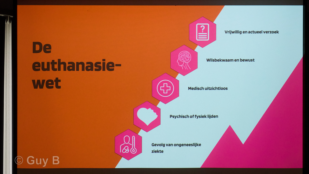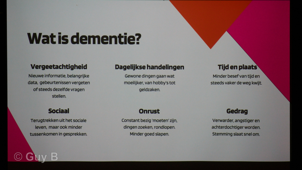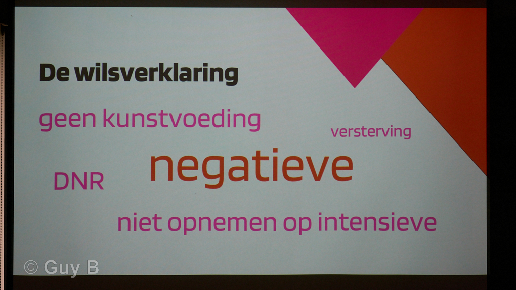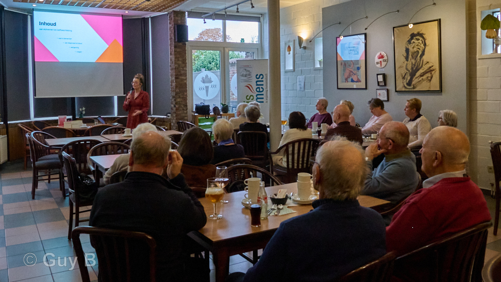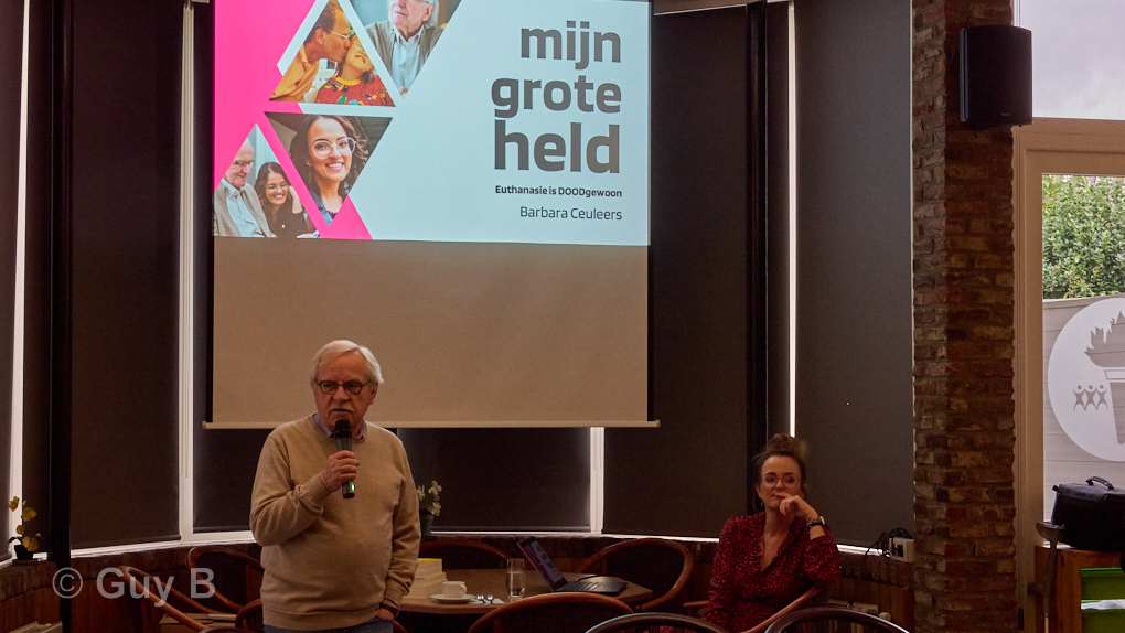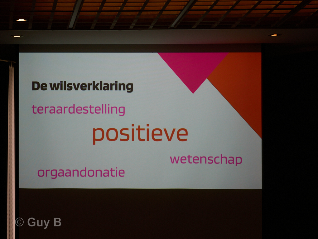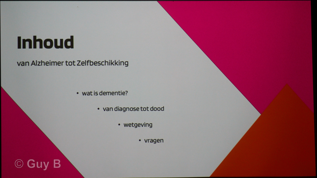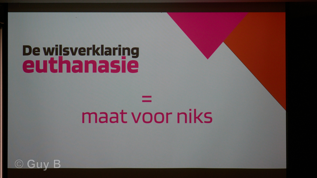 Momenteel wordt één op vijf mensen dement… Iedereen heeft in zijn kennissenkring wel iemand die lijdt of geleden heeft aan deze vreselijke aftakelingsverschijnselen (dementie is geen ziekte maar een verzameling van ziektebeelden). Barbara vertelde over de ziekte van alzheimer die haar vader (en ook zijn moeder) overkwam en de uitweg die de politici geschapen hebben om voortijdig aan het lot te ontsnappen. Wat houden een negatieve en positieve wilsverklaring in en wat betekent een wilsverklaring euthanasie wanneer je plots met de feiten geconfronteerd wordt? Spijtig genoeg bleek er nogal weinig interesse voor deze nochtans uiterst interessante lezing…