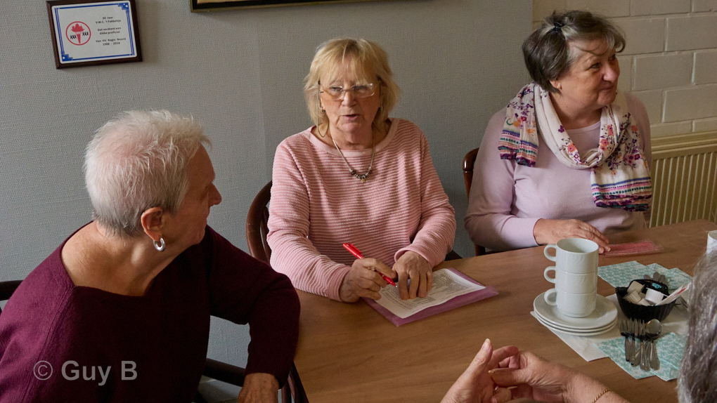 Na de Nieuwjaarswensen en de klassieke toast op het nieuwe jaar was het tijd voor het administratieve deel: penningmeester Lea gaf uitleg over de financies, José en Monique tekenden voor akkoord en Suzanne gaf een overzicht over de activiteiten van het voorbije jaar. Onverwacht bracht José nog een mooi stuk proza. Daarna was het tijd voor de appelbollen en koffie. Na het versterken van de innerlijke mens kon iedereen genieten van de fotografische herinneringen aan de 5-daagse groepsreis naar Picardië, heel netjes verzorgd door Pros.