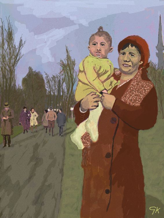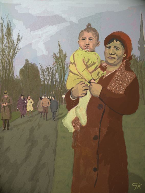 Mijn moeder met mijn oudste broer Piet in het kasteelpark in Helmond. De zwart-witfoto die als voorbeeld heeft gediend voor deze tekening is van 1934.