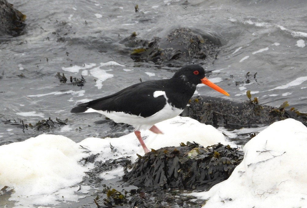 Aan de overkant van de dijk zitten Scholeksters te zoeken naar eten , in het Engels heet deze vogel Oystercatcher en dat is ook wat hij hier doet . Aangespoelde Oesters of Mossels zijn het voedsel waar hij naar op zoek is . Mossels groeien hier bij de vleet op de stenen onderkant van de dijk . Bij laagwater zie je ze in kleine groepjes vasthangen aan wat groen .