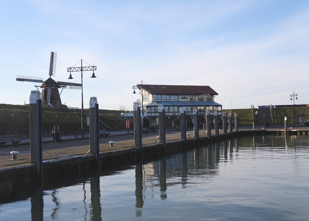 Het dorp Oudenschild ligt volledig achter de dijk , bij een haven lukt dat natuurlijk niet en hier is er zelfs één Hotel in de haven dat voor de dijk ligt. De windmolen hebben ze achter de dijk gezet .