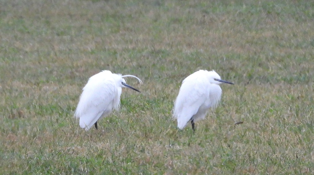 Dieren kunnen ook emoties tonen , bij deze twee Kleine Zilverreigers zie je duidelijk dat ze liever zon hebben dan deze druilerige mist en motregen .