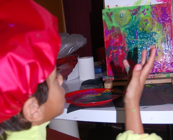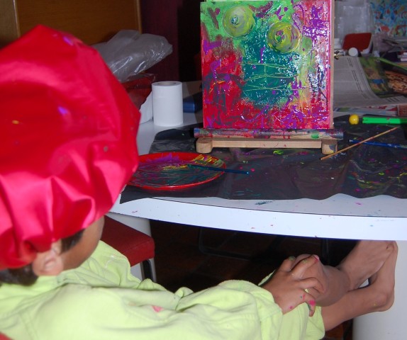 Doordat ik de ziekte van méniere heb moet ik eerst uren tot stilte komen voor ik naar bed kan Anders slaap ik geen moment dus.. werd het vannacht behoorlijk laat Tja, sta je even niet bij stil dat er tien over zes al eentje aan je arm staat te trekken Omaaaa wakker worden! voor je er erg in hebt dat het nog akelig vroeg in de morgen is ben je al doende om de boel te regelen Klaar wakker is Glenn en moet zijn tabletjes hebben anders stuitert hij dwars door het huis heen Half acht zat dus deze oma met een schilderende Glenn al te haken aan Senne haar nieuwe truitje Croissants al gebakken zelfs Ondertussen zijn mijn oren wakkerder dan ooit Loopt het kereltje in kiel en al te schetteren natuurlijk Van tv naar schilderij nu deze kleur en dan weer die ik word een echte kunstenaar hoor niemand zegt hoe het moet worden he als ik er maar blij van word! Dit kereltje snapt al na 1 x hoe het zit met ECHTE kunst oreren kan hij aan 1 stuk door dus schetteren ook