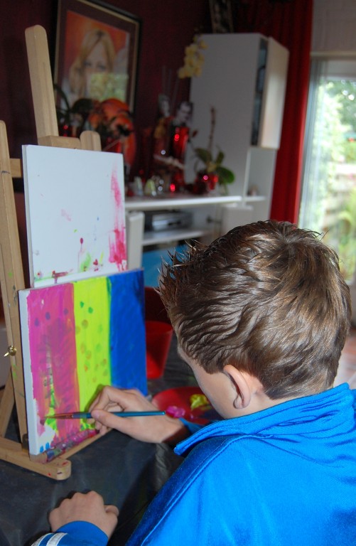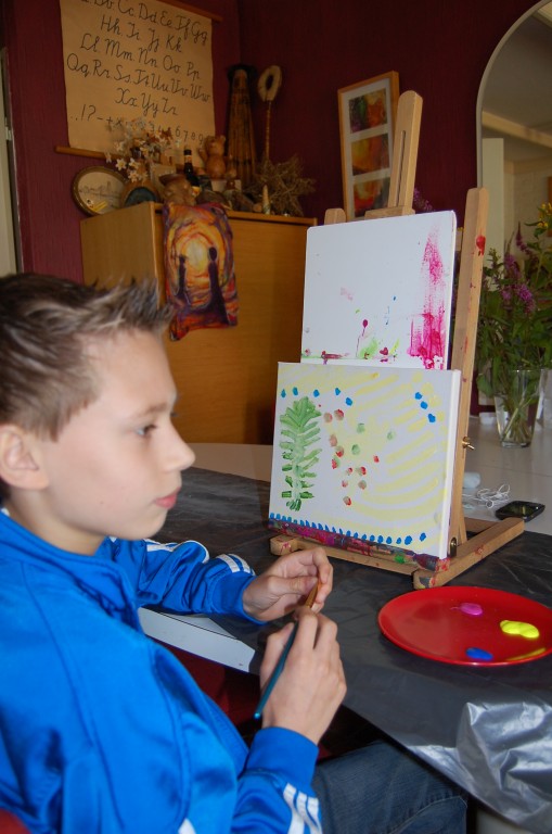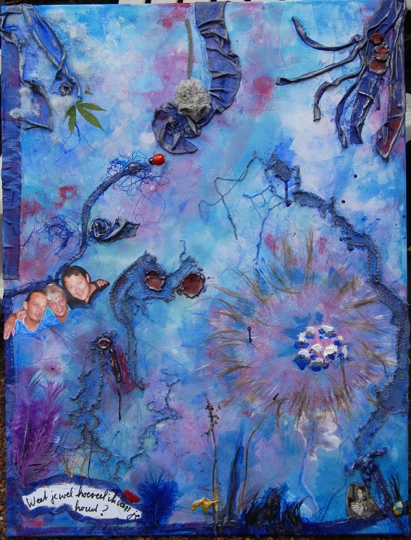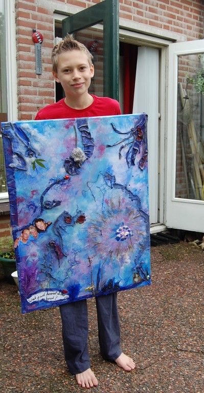 Omdat ik met mensen vaak op 1 doek werk en die zo met elkaar verweven zijn Heeft mijn zus Gerrike ook een doekje laten bezorgen met een half werkstuk avn zichzelf er op Hier mag Floris over heen gaan Met zijn oma op een doek saam