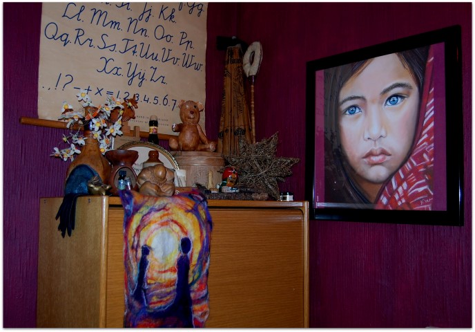 Even nog een kiekje van hoe t meiske nu echt goed in haar lijst is gekomen nummer drie alweer! heerlijk hier in huis-met of zonder muis Liet ik toch gisteravond een zakje kaaskruimels vallen in de keuken, en al veegde ik natuurlijk alles bij Er was toch wat bibberatie bij mij De kleine rattevangertjes liepen steeds in de keuken rond stel er lag nog meer lekkers op de grond Vanmorgen dus maar extra goed geveegd Steeds denk ik dan aan zo 'n heel lief klein diertje zoals je ze wel eens ziet in hun kooitje Tja, desondansk blijf ik wat angstig rondhupsen door het huis voelt voor mij nog steeds niet pluis Die akelige kou haalde ze naar binnen waar kan ik als huisvrouw dan veilig beginnen? Snel mijn gedachte dus verzetten en op dat grut wat minder letten!