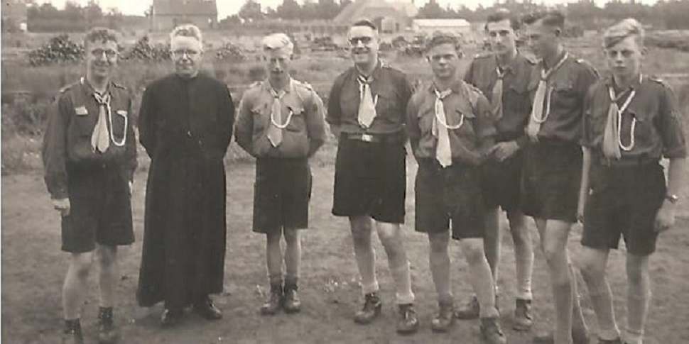 -De eerste leiding van de Leestse Jongenschiro. V.l.n.r. : Frans Gillis uit Merchtem, de nationale proost, Miel Polfliet, een arrondissementsleider, Gaston Keulemans, Eddy Beterams, Karel Fierens en toen al Louis Vloebergh.
