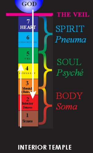 De pijl op het schema hierboven geeft een lichtstraal aan die van God neerdaalt. De duivel kan niet binnentreden in de vierde, vijfde, zesde of zevende verblijfplaats. De beslissing valt in de derde verblijfplaats: ofwel bouw ik daar een valse spiritualiteit op, gebaseerd op mijn eigen gedachten (zeer gevaarlijk), die slechts dekruimels van de Geest zijn – waaruit ik mijn eigen geestelijke keuken maak, een parodie – óf ik richt mij op de hogere geestelijke sferen van de vierde tot de zevende verblijfplaats. Volgende week zullen we onderzoeken hoe we concreet de sprong naar de geest kunnen maken in de vierde verblijfplaats: het intellect.