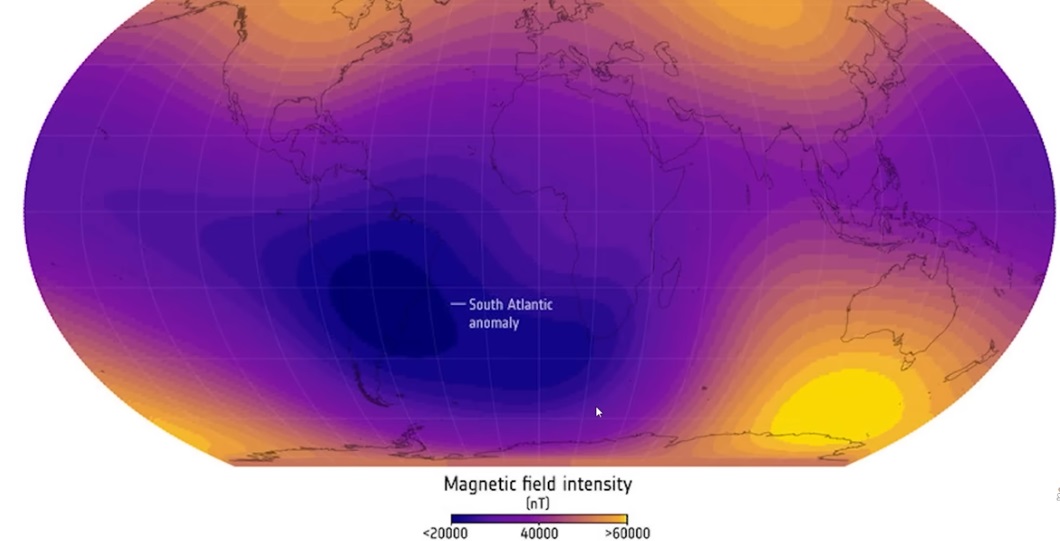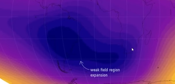 De zwakste regio van de aardmagnetisch veld is gesitueerd boven Zuid-Amerika en komt nu tot bij Zuid-Afrika (dit is in een verloop van 11 jaar)