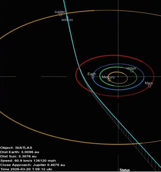 De normale koers die op 20/3/2026 3I/Atlas tot dicht bij Jupiter zou brengen: