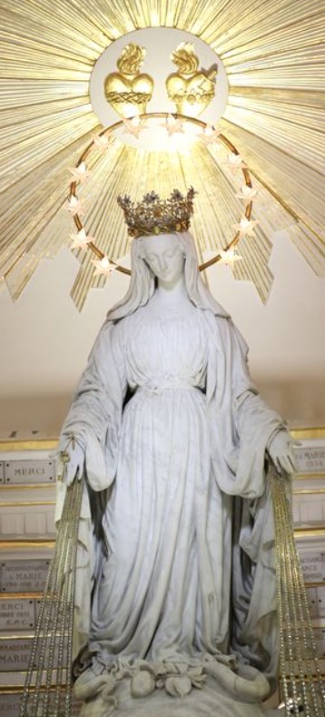 * Verschijning op 27/11/1830 Rue du Bac in Parijs aan Catherine Labouré in verband met Maria als Middelares van alle genade: Maria blijft staan ter hoogte van het schilderij van St. Jozef, ze lijkt te zweven in de ruimte. Maria lijkt licht uit te stralen in haar gewaad met wijde mouwen. Ze draagt ook een lange sluier welke ze over haar hoofd draagt en over haar schouders naar beneden hangt. In haar handen draagt ze een gouden bol met een kruis erop. Ze biedt deze bol aan God aan, terwijl ze haar ogen hemelwaarts richt, als om genaden af te smeken. Onmiddellijk wordt ze verhoord.