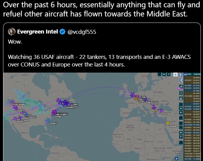 Op Flightradar24 en andere trackers is een patroon te zien dat alleen voorkomt bij grote luchtoorlogen: een "brug" van honderden Amerikaanse tankvliegtuigen (KC-135 en KC-46) die van de VS naar Europa en het Midden-Oosten vliegen.