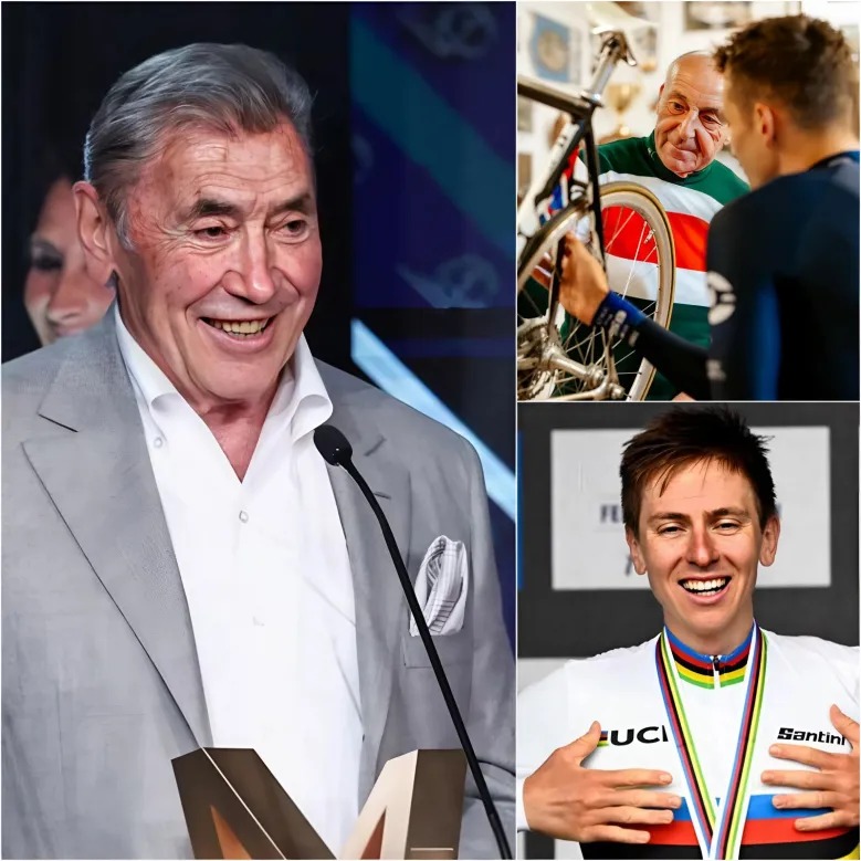 Eddy Merckx gaf Tadej Pogañar een vintage fiets die hij gebruikte toen hij de Tour de France van 1974 won, met de ontroerende boodschap: “Je hebt een vuur. Laat het lawaai het niet doven.” Een bescheiden maar krachtig gebaar, dat een hele nieuwe generatie wielrenners zou kunnen inspireren. Tadej Pogañar reageerde op dit geschenk met een kleine daad die Eddy Merckx diep ontroerde en ontroerde…!!!!