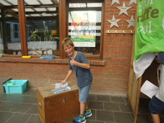 Vorige week mochten de kinderen in een officieel stemhokje twee kindjes kiezen die ze graag zouden zien in de leerlingenraad of MOS-raad. De kinderen namen hun taak heel serieus op en gingen één voor één gaan stemmen.