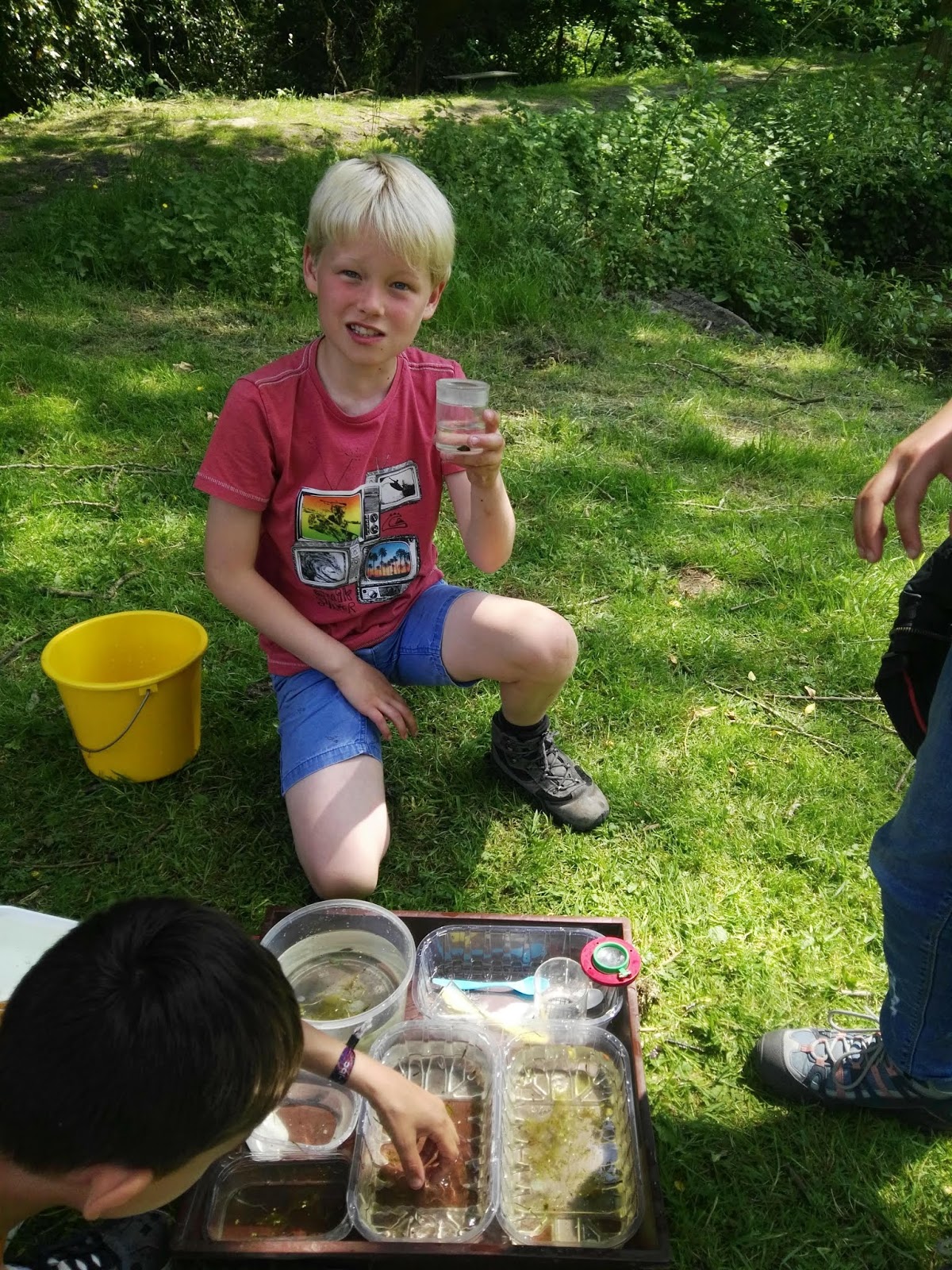 De zon was van de partij. Achter de bibliotheek konden we er volop van genieten terwijl we waterdiertjes opvisten. De kinderen genoten met volle teugen. We eindigden de namiddag met een leuk spel rond de voedselpiramide.