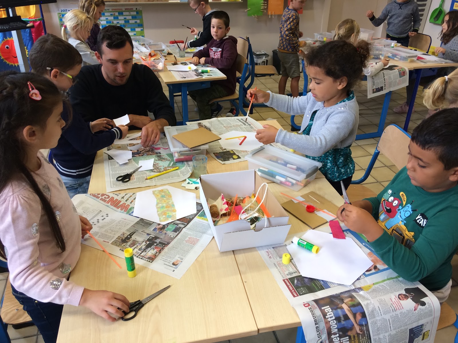 Vorige week kwam meester Laurens een weekje op bezoek in de klas. Hij zorgde voor een leuke knutselactiviteit. De kinderen mochten heel creatief met allerlei materialen een eigen bijenkamertje maken. Samen maakten ze een heel mooie bijenkorf!