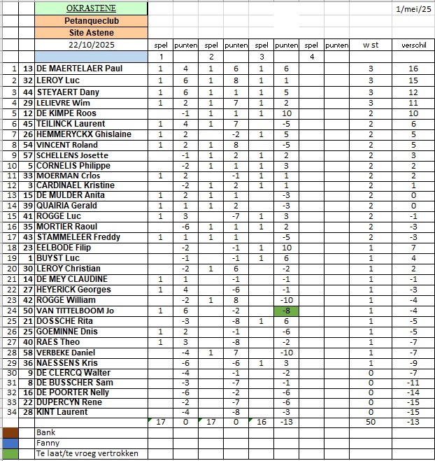 Nog even dit om af te sluiten: maandag e.k. 20 oktober is het tornooinamiddag. Astenekermis onder de alom geprezen organisatie van Luc Leroy. 16 triplettes zullen strijden voor de beker. Heb je niks te doen maandagnamiddag kom even supporteren en ga daarna oliebollen eten op de kermis!