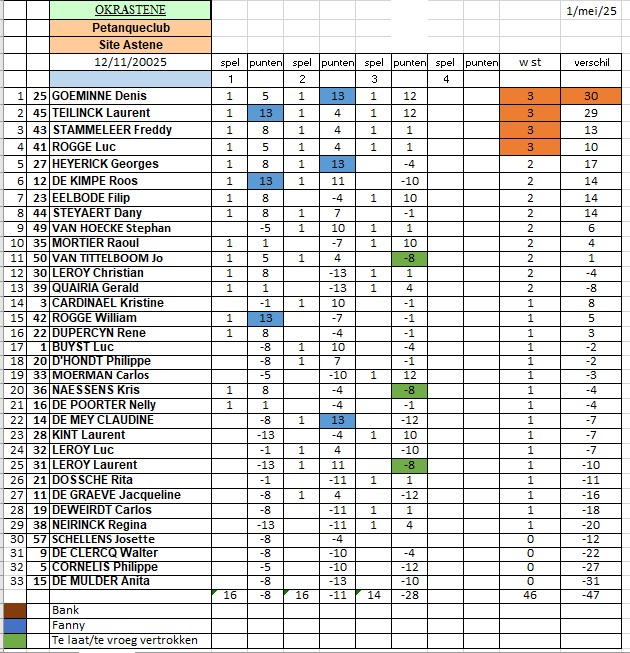 Nog even dit om af te sluiten: maandag e.k. 20 oktober is het tornooinamiddag. Astenekermis onder de alom geprezen organisatie van Luc Leroy. 16 triplettes zullen strijden voor de beker. Heb je niks te doen maandagnamiddag kom even supporteren en ga daarna oliebollen eten op de kermis!