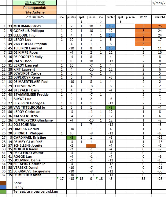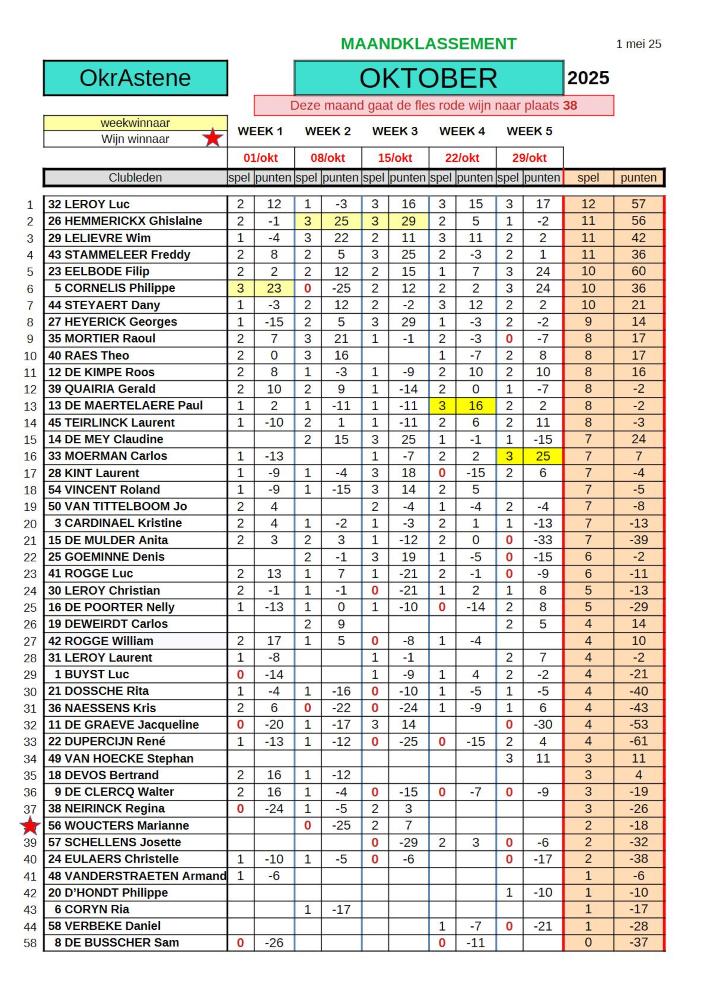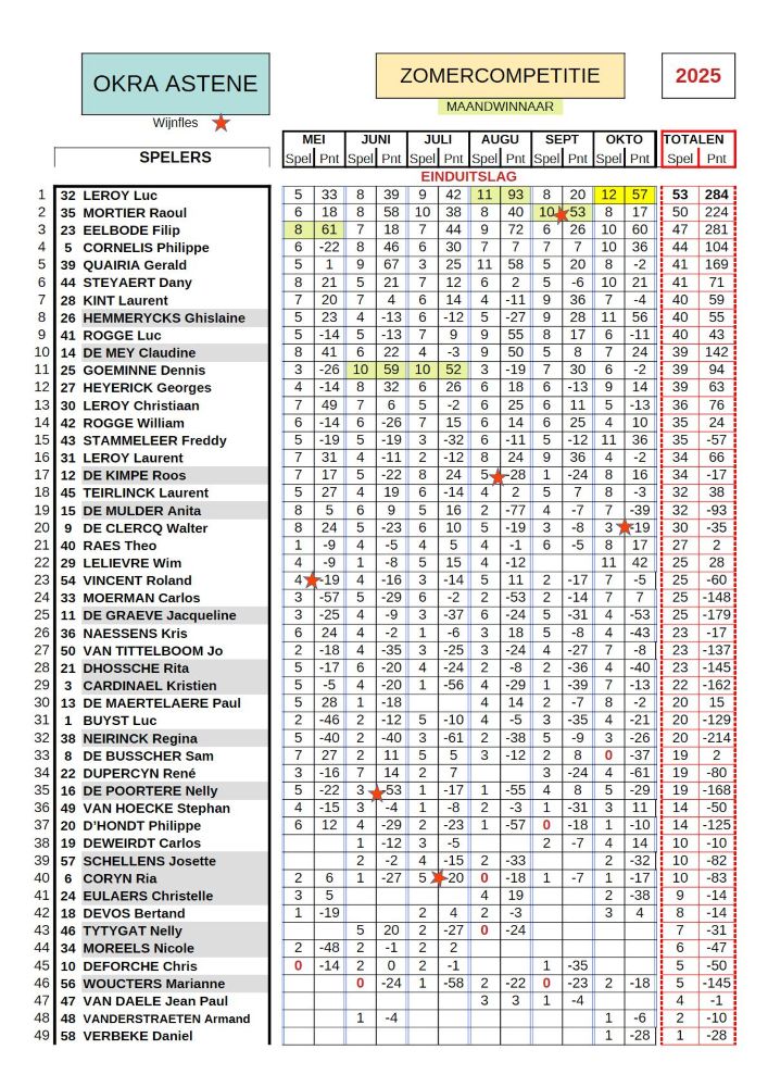 De maandwinnaar is... Luc Leroy die de grote slokop van de zomer 2025 wordt! Met 11 overwinningen op de 15 volgt een niet gebruikelijk trio: Ghislaine (tweede), Wim (derde) en Freddy (vierde). Enkele spelers blijken te zijn uitgeblust na deze vermoeiende en warme zomer! Raoul, Denis, William, Kris, Luc Rogge en onze voorzitter Walter. Deze laatste kan het steken op het vele werk dat een voorzittersschap behelst. Bewijs... onze vorige voorzitter heeft daar geen last meer van! Deze maand eindigt hij op de 7-de plaats en in de zomerrangschikking op de 6-de plaats en dat na 88 jaar te zijn geworden en dikwijls zonder schutters in de triplette!