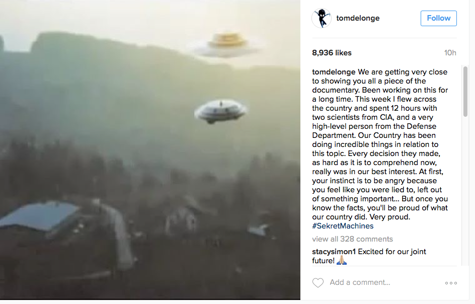 Date of Instagram: July 24, 2016 Tom Delonge of Blink-182 had been in the news a lot for his interest in UFOs and alien phenomenon. Today he made a post on Instagram about a UFO documentary that he is personally making. I can't wait to see it. It sound fantastic. Scott C. Waring www.ufosightingsdaily.com Tom Delonge stated: We are getting very close to showing you all a piece of the documentary. Been working on this for a long time. This week I flew across the country and spent 12 hours with two scientists from CIA, and a very high-level person from the Defense Department. Our Country has been doing incredible things in relation to this topic. Every decision they made, as hard as it is to comprehend now, really was in our best interest. At first, your instinct is to be angry because you feel like you were lied to, left out of something important... But once you know the facts, you'll be proud of what our country did. Very proud. #SekretMachines
