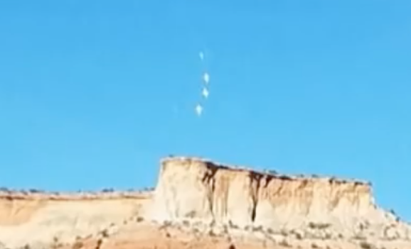 The short clip appears to show two UFOs flying in front of a canyon near the Nellis Air Force base in Las Vegas Valley, Nevada, US.