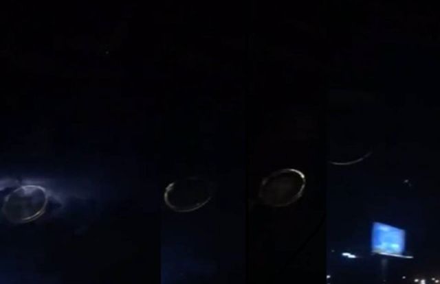 The unique footage shows lightning in the background when suddenly a UFO disk appears from out of the dark night sky.