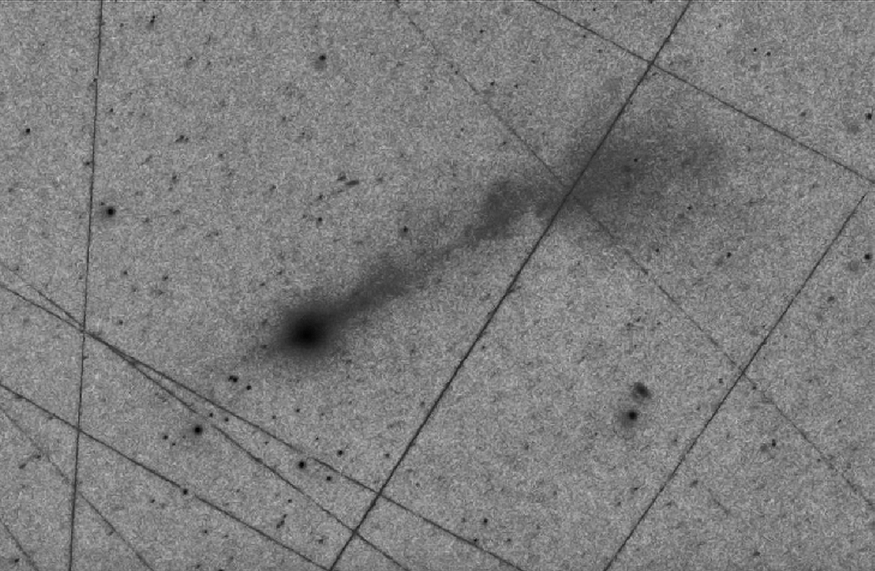 Diepteopname van 3I/ATLAS door de Gemini South-telescoop op 27 augustus 2025. De afbeelding toont de brede coma met een lengte van ongeveer 1/120e graad aan de hemel. Foto: International Gemini Observatory/NOIRLab/NSF/AURA/Shadow the Scientist. Beeldbewerking: J. Miller & M. Rodriguez (International Gemini Observatory/NSF NOIRLab), T.A. Rector (University of Alaska Anchorage/NSF NOIRLab), M. Zamani (NSF NOIRLab)