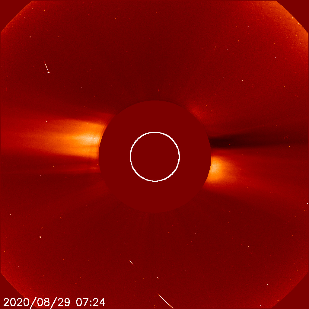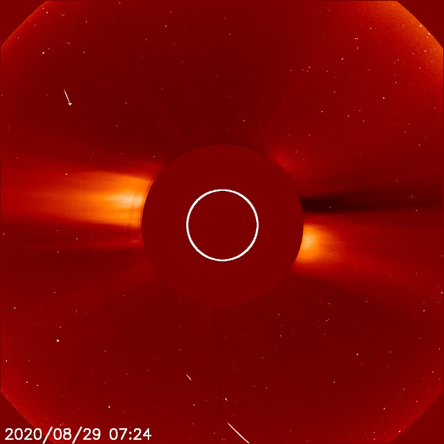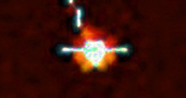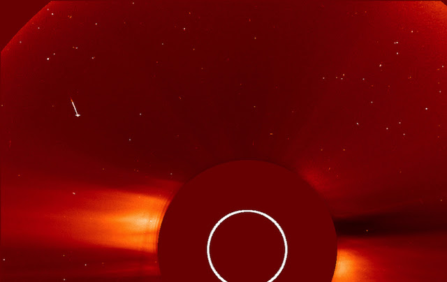 I found a huge UFO near our sun today. The UFO is about 1/2 the size of our moon. When I add darkness to bring out the details (in 2 photos above) I find that the detail of the craft becomes apparent. There are two wing like arms on each side. The craft also is pointed in the front area and is wide and flat in the back area of the ship. There is a blur around the craft...which I believe to be a force field protecting the ship. I have to say I was surprised at the above screenshots details. I had not expected to find such a high quality outline of the craft and shield area. It is expelling something out the back of the craft, but I believe that it must in order to appear as a meteor or comet to force all astronomers into believing its not a UFO. But...we are smarter than than aliens think.