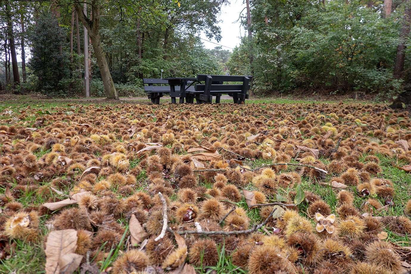 De herfst komt nu echt goed op gang. Ik heb alweer wat meer verkleurende bladeren gezien en er ook enkele foto's van gescoord maar dat zal in de loop van de volgende weken nog veel beter worden neem ik aan. Een ander pluspunt van de herfst is dat er weer kastanjes zijn. Ik had er al enkele opgeraapt links en rechts maar geproefd heb ik ze nog niet. Toen ik vandaag voorbij het driehoekig pleintje tussen het Vennepad, de Huyskens en het Eindeke fietste zag ik dit tapijt en ik kon niet anders dan stoppen om deze foto te maken.
