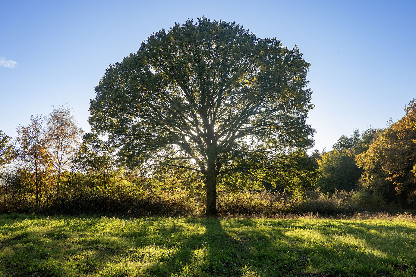 Ik weet eigenlijk niet of je over een lievelingsboom kunt spreken, maar dit is alleszins de boom die ik tot nu toe het vaakst gefotografeerd heb. Er is ooit zelfs een jaar geweest waarin ik hem iedere maand van op precies dezelfde plek, met dezelfde instellingen heb vastgelegd en uit die reeks heb ik er toen 4 gekozen om een vierluik te maken om op ons fotosalon te tonen... En ook nu nog, telkens als we er voorbij fietsen roept ie me en ik kan niet weerstaan aan zijn vraag. Mooi tegenlicht en ik heb een positie gezocht waar de zon, die zo mooi doorheen zijn kruin scheen, netjes achter de stam verborgen zat. Dit is trouwens niet het standpunt van de reeks van lang geleden, dat is ondertussen helemaal dicht gegroeid.