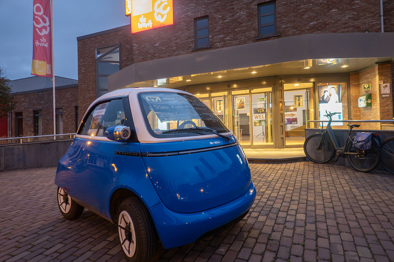 We waren gaan fietsen maar al gauw voelde ik dat het vandaag niet zo goed lukte. We zijn dan ook na enkele kilometers weer naar huis terug gekeerd. Om verder toch iets leuks of iets nuttigs te doen vond ik dat ik dan maar eens met de wagen naar Geel kon rijden om het fotosalon van Fotogroep 71 te gaan bezoeken. Toen ik er aan kwam zag ik voor de ingang van De Werft dit "ding" en in de mening dat het een invaliden wagentje of iets dergelijks was van iemand die het salon ook bezocht ben ik er achteloos voorbij gelopen. Toen we een hele tijd later terug buiten kwamen stond dat er nog steeds en ben ik eens wat dichterbij gaan kijken. Het was warempel een publiciteit wagentje om de mensen te attenderen op het fotosalon. Links, rechts en op de voorruit hingen posters en toen ik die ging lezen merkte ik dat het affiches waren die het salon van 11 en 12 november 2023 (!!!) aankondigden. Zouden de organisatoren dan niet gemerkt hebben? Ik vrees dat in dit formaat de boodschap niet goed leesbaar is, maar indien gewenst stuur ik de afbeelding wel door in vol formaat.