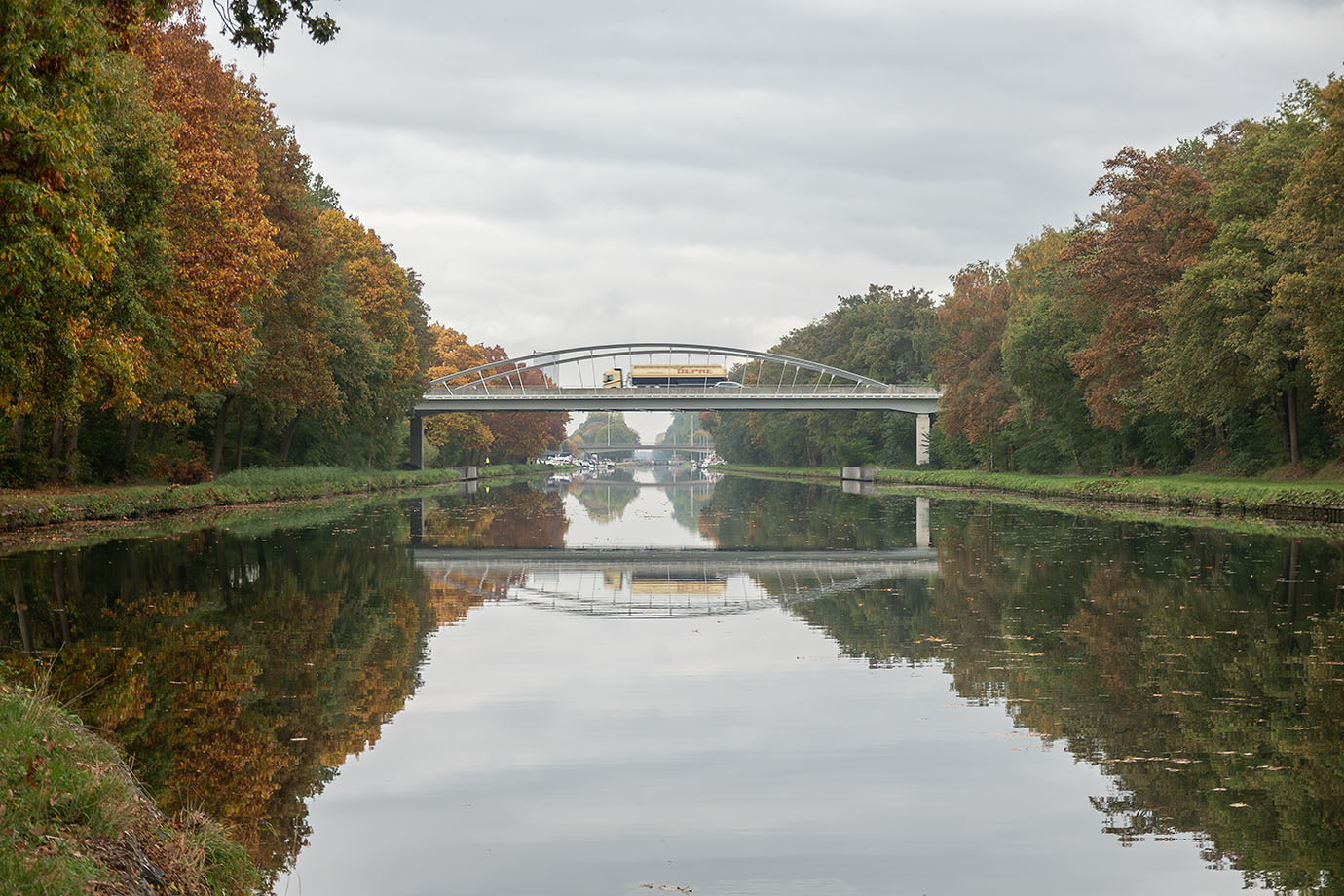 De kruik gaat te water tot ze breekt... en deze keer was het zo ver. Ik ben nat geworden tijdens mijn fietstocht. Het regende niet echt hard, helemaal niet, maar die miezerige bijna onzichtbare druppeltjes die je na een tijdje op je fietsbril moet wegvagen waren voldoende om me stiekem te doordrenken en er voor te zorgen dat ik verkleumd en vochtig terug thuis kwam. In de veronderstelling dat het ook vandaag wel droog zou blijven had ik trouwens geen regenkledij meegenomen. Stom! Langs het Kempisch kanaal ziet het er ondertussen ook al redelijk herfstig uit. Als je deze flink ingezoomde foto met de brug van de N19g bekijkt, met links en rechts de in prachtige kleuren getooide bomen, denk je dat het droog is, maar de stiekeme lichte nevel in de verte... dat zijn allemaal piepfijne druppeltjes die je de prijs laten betalen voor je overmoed.