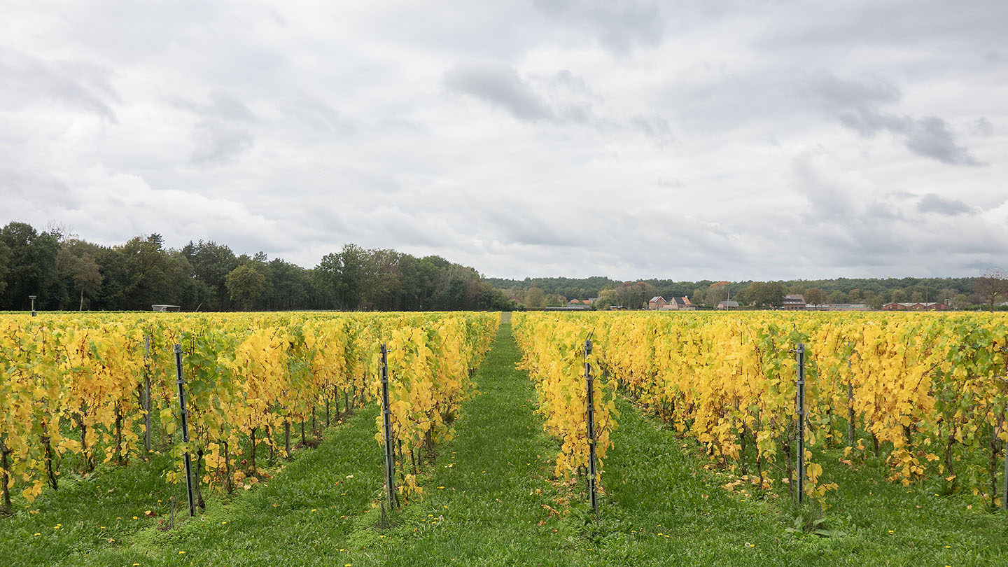 Ik ben geen klimaatspecialist maar je leest en hoort alom dat door de klimaatverandering de wijnproductie steeds meer naar het noorden opschuift. Ook in onze regio zie je tegenwoordig meer en meer percelen waar over grote oppervlakten druivenranken worden aangeplant en het is dan ook de bedoeling dat er ook wijn van wordt geproduceerd. Eerlijk gezegd, ik heb nog geen locale wijn geproefd, maar ik zou het toch wel eens willen proberen... Toen ik vandaag via de Arkstraat richting kanaal fietste ben ik even de Papendijk ingedraaid om dit herfstbeeld te plukken van de mooi verkleurende druivenranken die hun jaarlijkse taak hebben volbracht en nu klaar zijn om hun winterslaap aan te vangen.