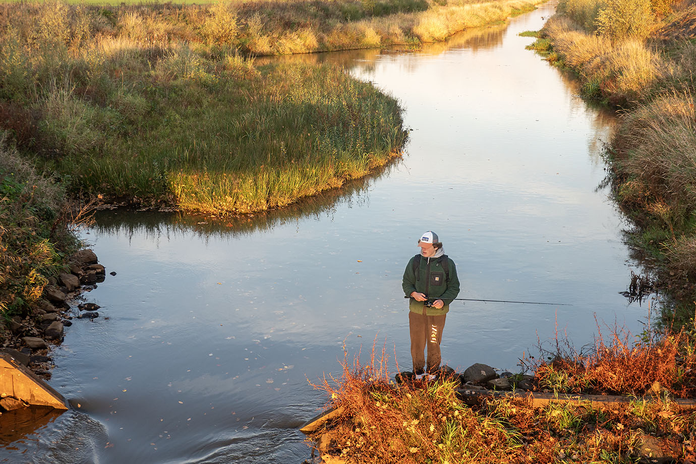 Het was al redelijk laat, de zon stond zeer laag en het licht was erg mooi. Toen we bij de Netebrug aan de Ark kwamen hadden we een stop gepland om te zien of er niks te fotograferen viel. Het zonlicht dat onder de brug door scheen zorgde voor een rijke kleurenpracht voorin en er stond warempel een jonge visser die tot zijn midden ook nog beschenen werd. Ik vond het speciaal en zulk beeld was een opportuniteit die ik niet kon laten liggen toch?