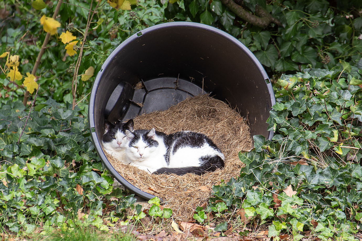 We waren vandaag wel verplicht om thuis te blijven. Er zou tussen 12 uur en 6 uur een werkman langs komen om de aansluiting van de waterleiding van een digitale meter te voorzien zodat de meteropname voortaan rechtstreeks doorgestuurd kan worden. En jammer genoeg kwam die kerel pas rond vier uur, toen ie klaar was was het te laat om er nog op uit te trekken. Ik heb dan maar in en rond het huis wat gefotografeerd en de twee verwilderde huiskatten die hier permanent rondhangen - het vrouwke zorgt er voor dat ze niks te kort komen - kreeg ik ook weer enkele keren voor mijn lens. Het vrouwke heeft trouwens ook gezorgd voor een veilig nestje onder de restanten van wat ooit het speelkasteel van de kleinkinderen was en dat er nu redelijk verwaarloosd bij ligt. Een oude plastic regenton met wat hooi erin weten die poezen wel te appreciëren. Dichtbij komen lukt niet, dan gaan ze lopen maar met de 300 mm plus een 1,4x extender op mijn toestel kon ik toch dit beeld schieten.