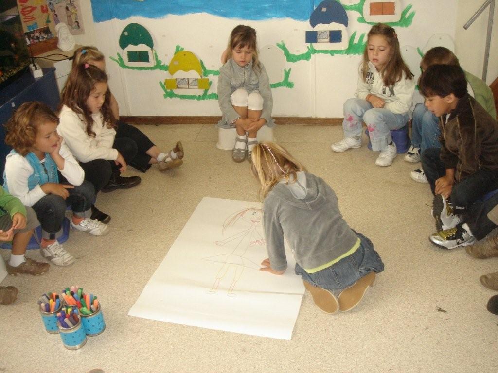 We bekeken alle details en keken elke helft na. Daarna werd alles aan elkaar teruggepuzzeld. Juf tekende een helft op een blad, de andere helft mochten onze rakkers zelf aanvullen. Heel wat denkwerk kwam hierbij kijken. Een halve neus? een halve mond? Maar wel een volledig oog en een ganse arm en been... gek hé. Op deze manier gingen kinderen om met asymmetrie en symmetrie.