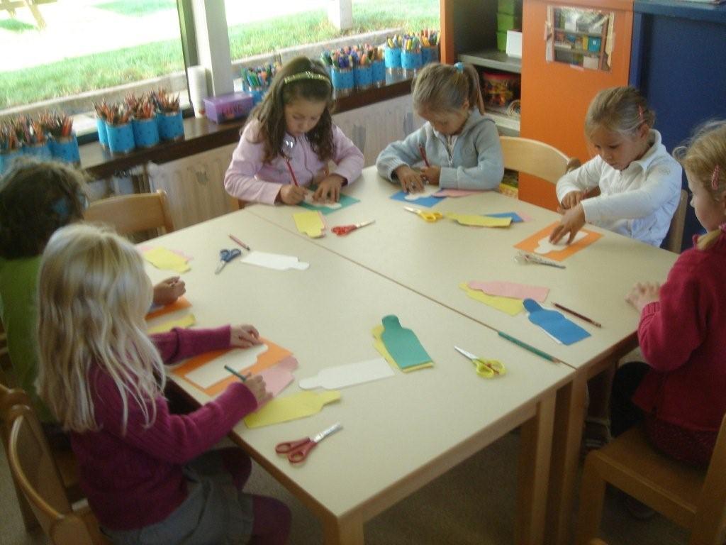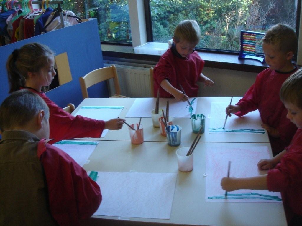 Een ander groepje werkte met kwast en verf. Zij schilderden de flessen (dagen) in de correcte kleur rekeninghoudend met de inhoud ervan. Welke fles is helemaal vol? Welke halfvol? Wat is halfvol? Tot waar is dat? Heel wat denkwerk...