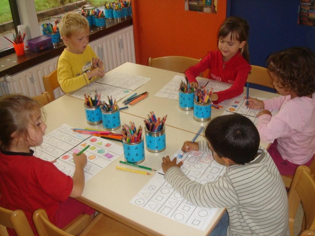 Onze rakkers kozen hun symbooltje... de klassieke logiblokkendoos werd naar bovengehaald! Wat is een driehoek, wat is een vierhoek, wat is een schijf? Heel wat informatie vooraf, daarna aan het werk. Individueel gingen ze op zoek naar dezelfde vormen, daarna kleuren in de juiste kleur. Concentratie en heel wat taakbereidheid gevraagd van onze rakkers!