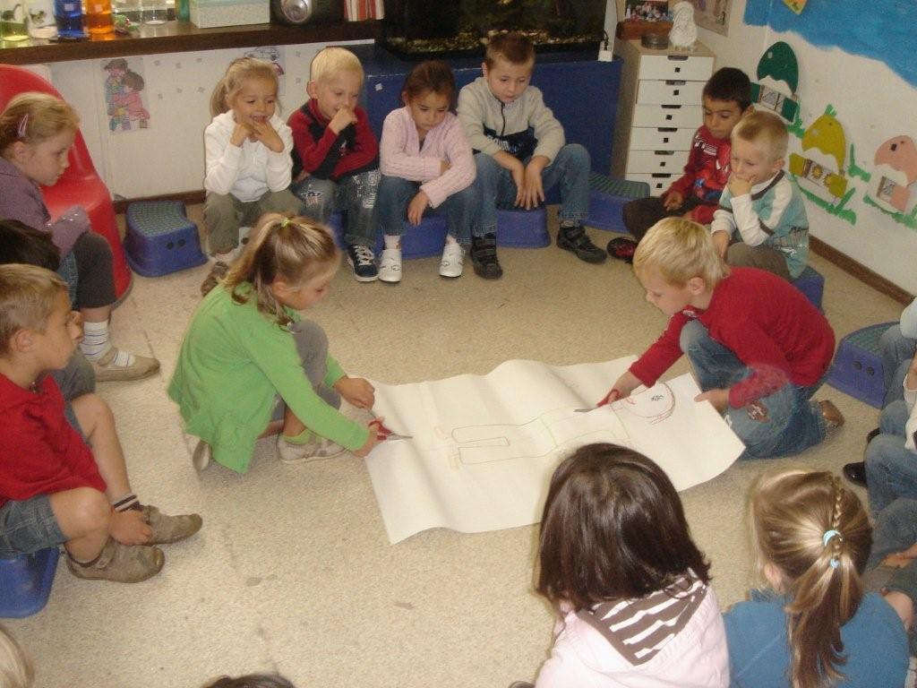 We bekeken alle details en keken elke helft na. Daarna werd alles aan elkaar teruggepuzzeld. Juf tekende een helft op een blad, de andere helft mochten onze rakkers zelf aanvullen. Heel wat denkwerk kwam hierbij kijken. Een halve neus? een halve mond? Maar wel een volledig oog en een ganse arm en been... gek hé. Op deze manier gingen kinderen om met asymmetrie en symmetrie.