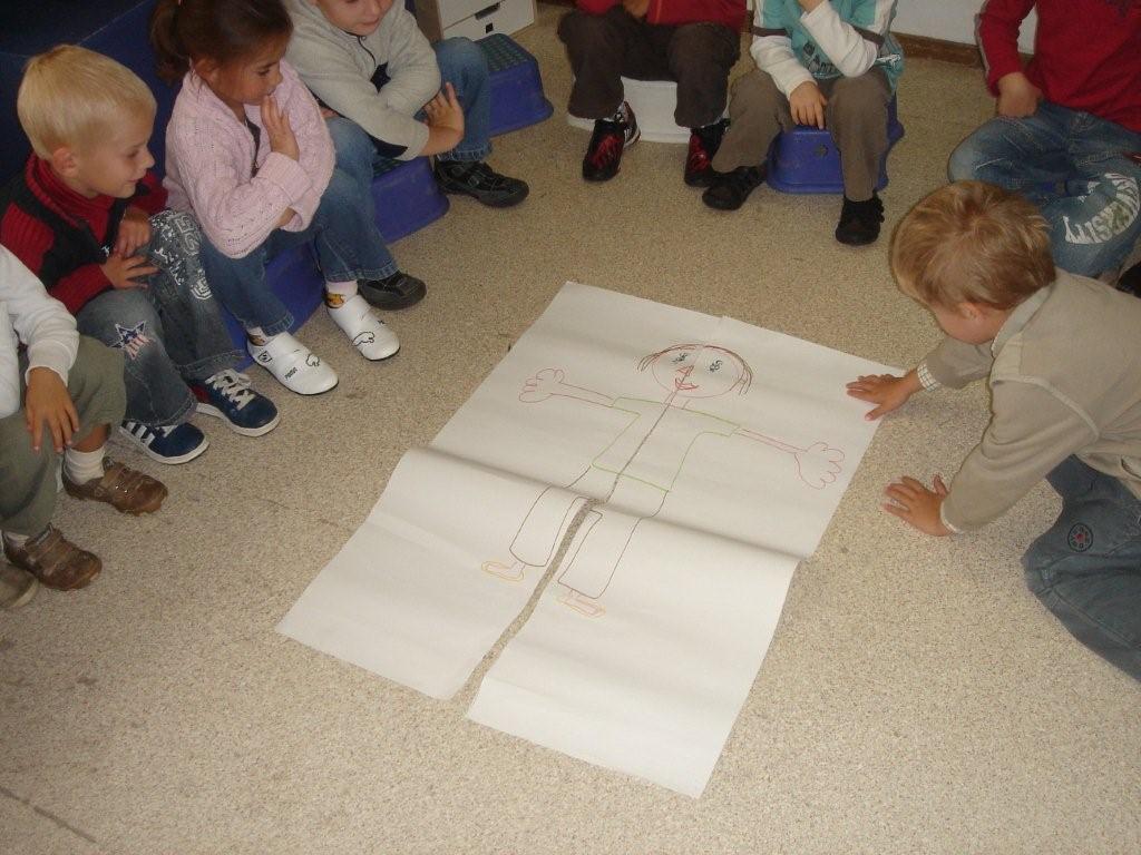 Deze week werken we in onze rakkerklas rond het lichaam. Heel wat nieuwe woordenschat wordt aangebracht alsook gebruikt. We hebben het over de lichaamsdelen over de functie van de lichaamsdelen,... Vandaag werkten we rond symmetrie. We knipten een lichaamsschema in 2 en dan bespreken maar...
