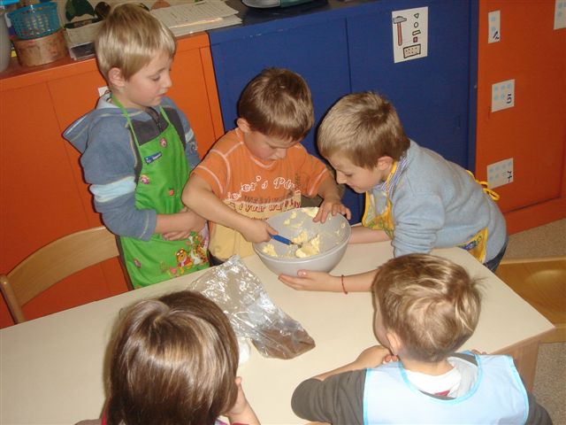 Iedereen zijn schort aangetrokken? Alle groepjes goed verdeeld? Dan kunnen we beginnen... Het eerste dat we op het stappenplan lezen is de boter pletten. Hoe kunnen we nu met 4 kleuters boter pletten. Samenwerking en afspraken maken was hier zeker een onderdeel van. 1 rakker nam de (houten) lepel vast en probeerde de boter zo mals mogelijk te krijgen. De overige rakkers probeerden de kom zo goed mogelijk vast te houden... want er zat veel beweging in.