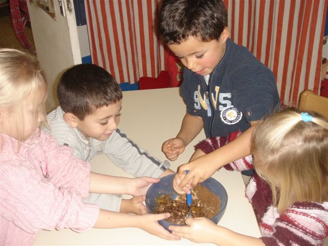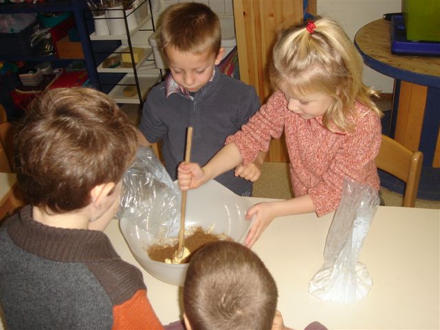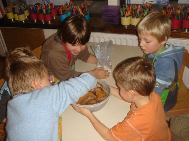 De bruine suiker hebben we reeds onder de malse boter gemengd... maar toch maar raar hoor. Wat een droge bedoening. Oei, we zijn ons eitje vergeten. De juf breekt de eierschaal en het eiwit en de eierdooier vallen bij de boter en de bruine suiker. Opnieuw roeren is de boodschap!