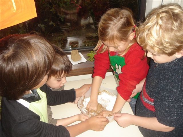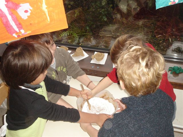 Als slot voegen we alle 4 groepjes hun speculaasdeeg bij elkaar en vormen 1 dikke deegbol. Hieronder werd nog wat bakpoeder toegevoegd en klaar is kees.... althans voor nu toch. Ons recept vertelt ons het speculaasdeeg 1 nachtje te laten rusten in de koelkast!!