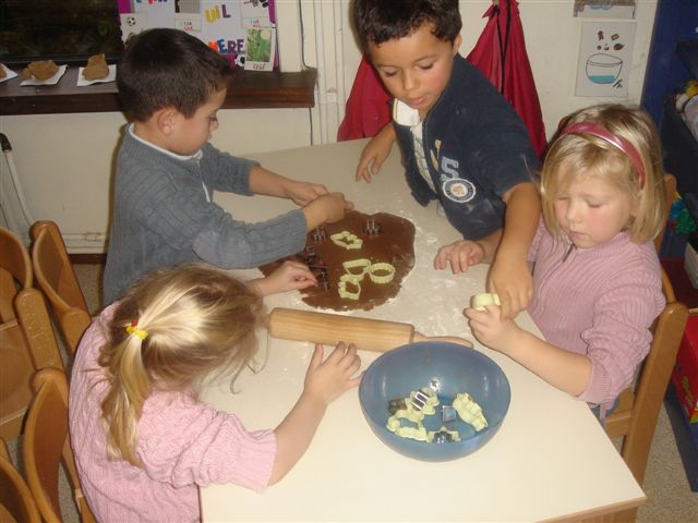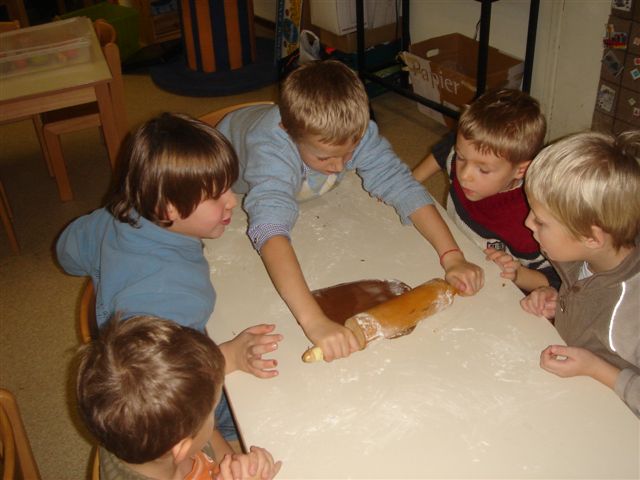 Vrijdag 7/12, na onze turnles, trokken we de deur van de koelkast open. We namen het speculaasdeeg eruit en keken even terug op het stappenplan. Dit vertelde ons dat we mochten werken met de deegrol. Deegrollen waren er in overvloed. We verdeelden ons terug in groepjes en gingen aan het werk. Onze rakkers wisten heel vlug wat hen te doen stond! Eerst wat bloem op de tafels en aan de deegrol... anders plakt het speculaasdeeg aan de tafel en plakt de deegrol aan het deeg (dit wisten we nog van bij het maken van de koejes voor oma en opa)