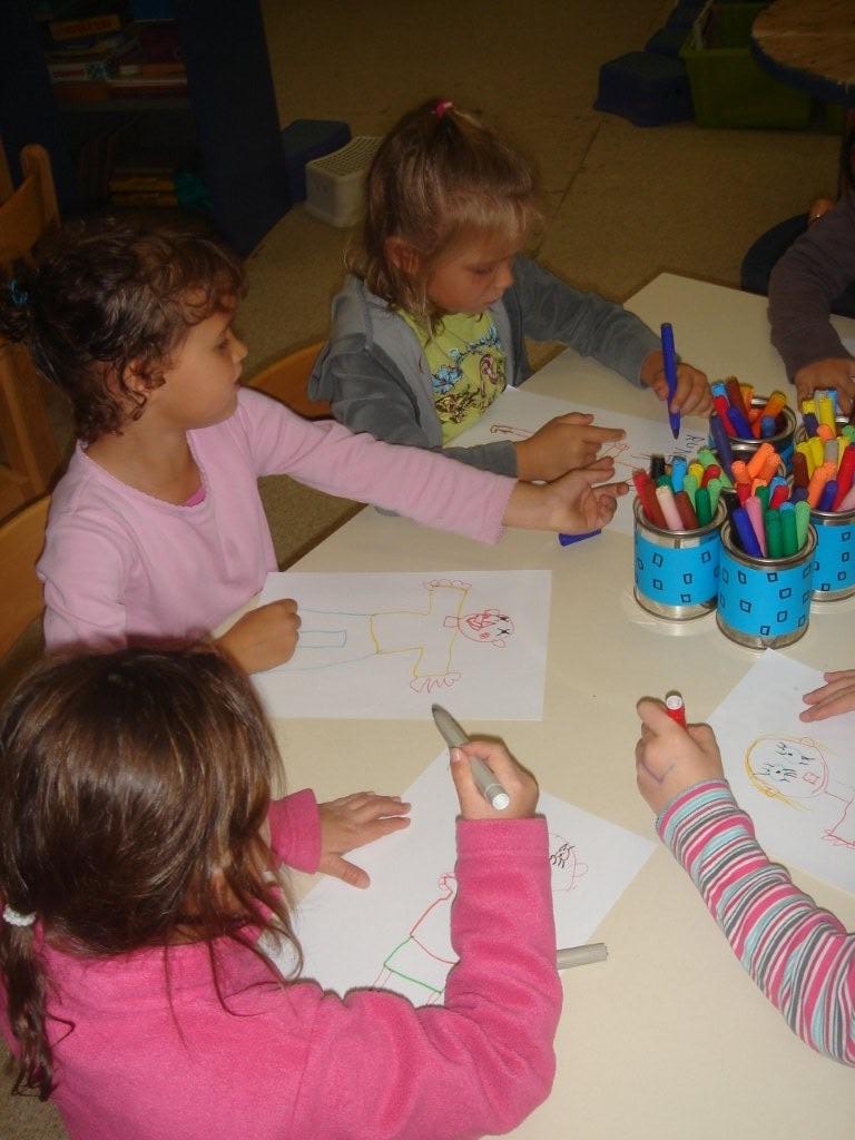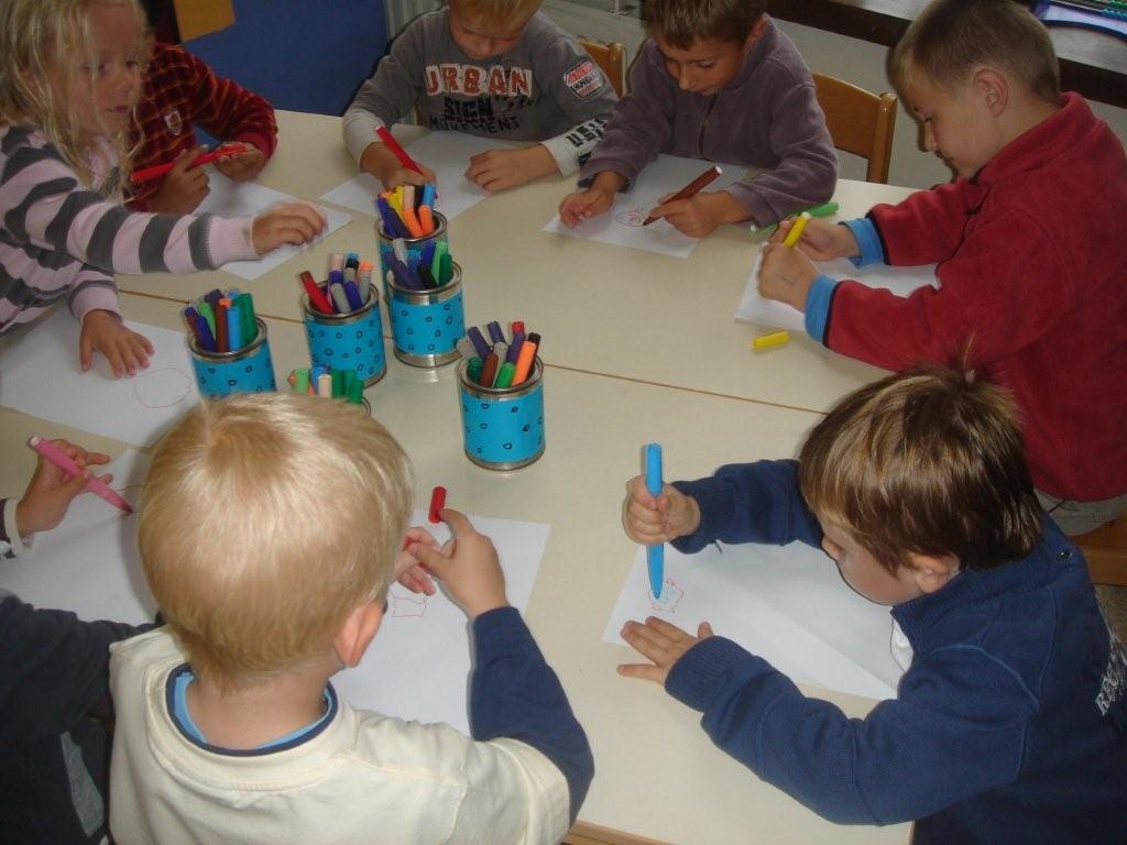 Onze rakkers vertelden aan elkaar met welk hand zij alles doen. Weten we of het links of rechts is. Dit bracht heel wat gespreksstof met zich mee. Hoe moeilijk is het om te tekenen met een linkerhand als je normaal rechtshandig bent? We proberen het... onze rakkers werden uitgenodigd om is omgekeerd te werken! Niet makkelijk maar het proberen waard.