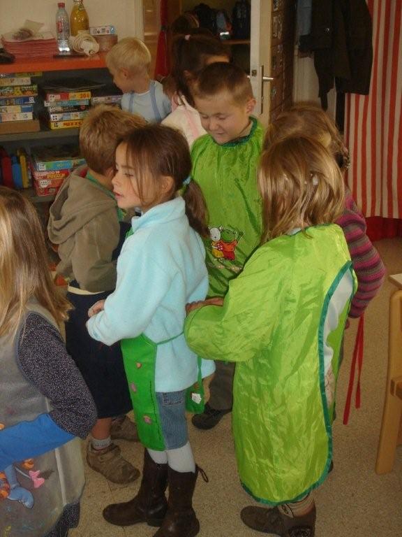Een ander groepje werkte met papier en de vouwtechniek. De juf toonde eerst hoe het moest, daarna gingen de rakkers zelf aan het werk. Wie weet nog hoe het moest? Al onze rakkers vouwden een 'friet -of oliebollenzakje'. Nu nog vullen!