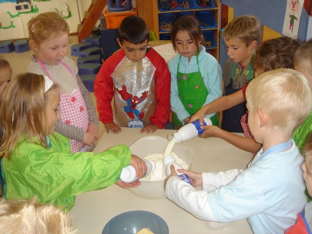 Juf leest het recept voor, onze rakkers brengen alles in de kom. Eerst de bloem. Deze werd eerst gewogen met een weegschaal. Daarna de melk. Hiervoor hadden we een maatbeker nodig.