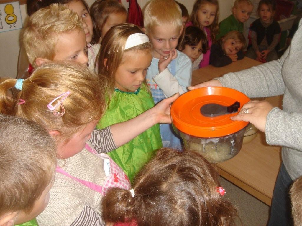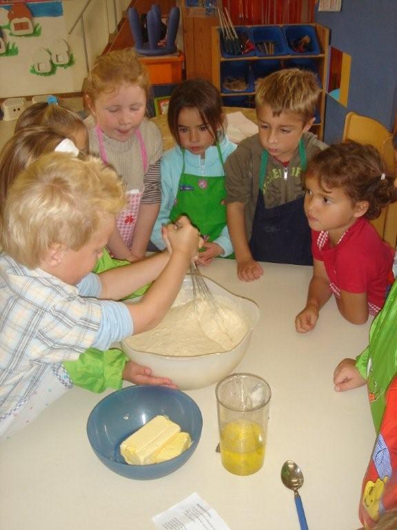 We gingen even kijken hoe ver juf Lut stond met haar beslag. Hé kijk, juf, juf Lut die gebruikt geen mixer. Juf legde uit dat dit een toestelletje was waar je zelf moest aan draaien, je mocht zelf de mixer spelen.