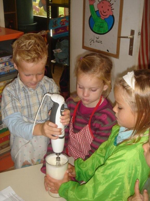 En wat met het eiwit, juf? Daarvoor mochten we de mixer gebruiken. Hoe werkt een mixer? Met een stekker. We brachten de stekker in het stopcontact. Hou de pot goed vast anders vliegt hij wellicht op de grond. Dan maar mixen ... al vlug werd het eiwit stevig en wit.