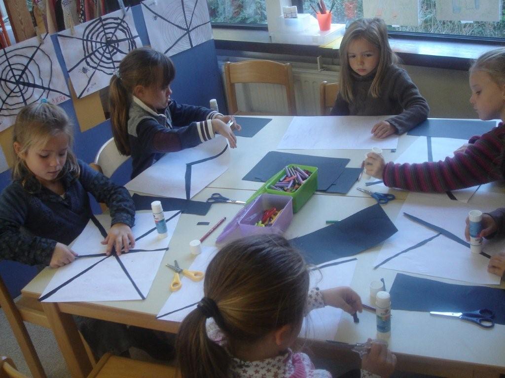 Een ander groepje bouwde een spinneweb op. Hoe doet de spin dit? Eerst de basisdraden maken... onze rakkers deden dit zeer nauwkeurig met papier, schrijfpotlood, lijm en schaar. Nauwkeurig werken, meten,... het hoort er allemaal bij.